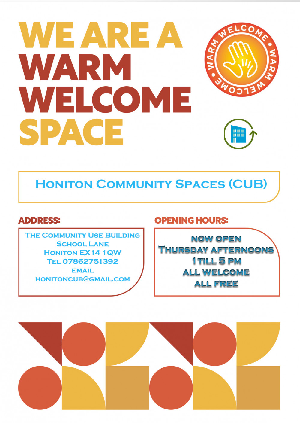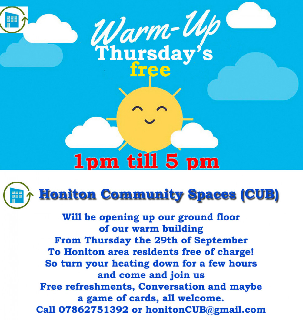Honiton Community Spaces (CUB) The Community Use Building School Lane Honiton EX14 1QW was Honitons first and as of today the only Hub in Honiton registered on the official Warm Welcome website Find a Warm Welcome Space Today